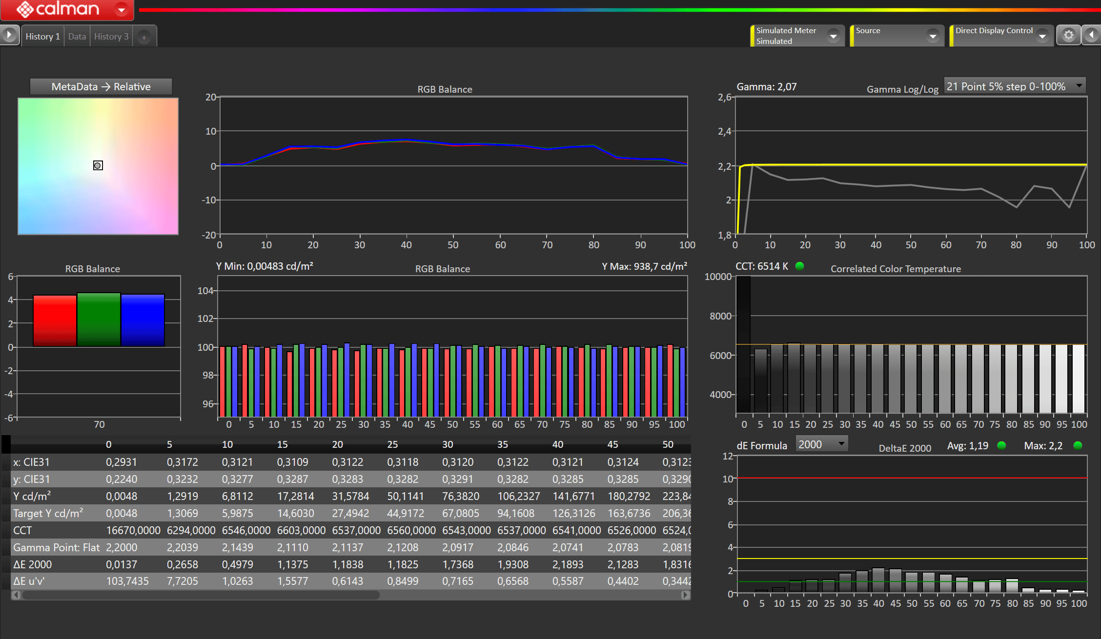 RGB-Verlauf nach Weißabgleich im Service-Menü (ColourSpace Calibration Software - Light Illusion)